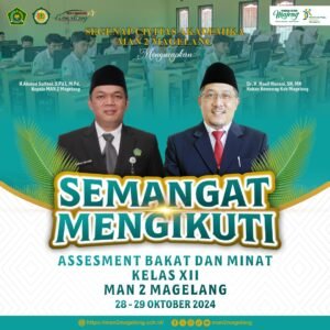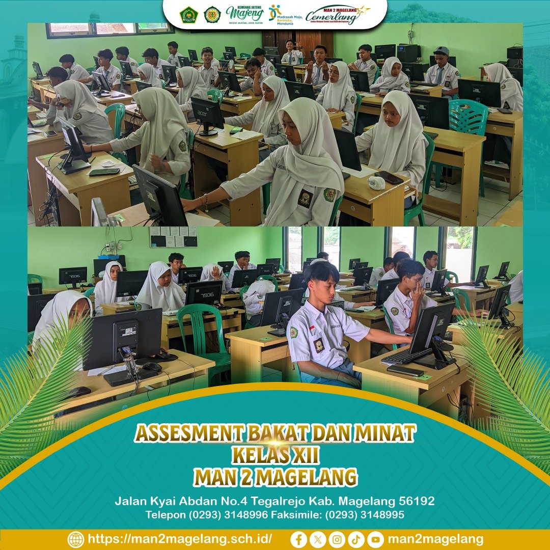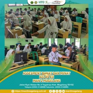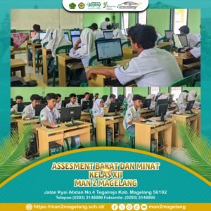 Magelang – Sebanyak 294 siswa kelas XII MAN 2 Magelang mengikuti Assesmen Bakat Minat (ABM) pada tanggal 28 hingga 29 Oktober 2024. Kegiatan ini bertujuan untuk mengetahui potensi dan minat setiap siswa, sehingga diharapkan dapat membantu dalam penentuan jurusan atau bidang karier yang sesuai di masa depan (29/10).