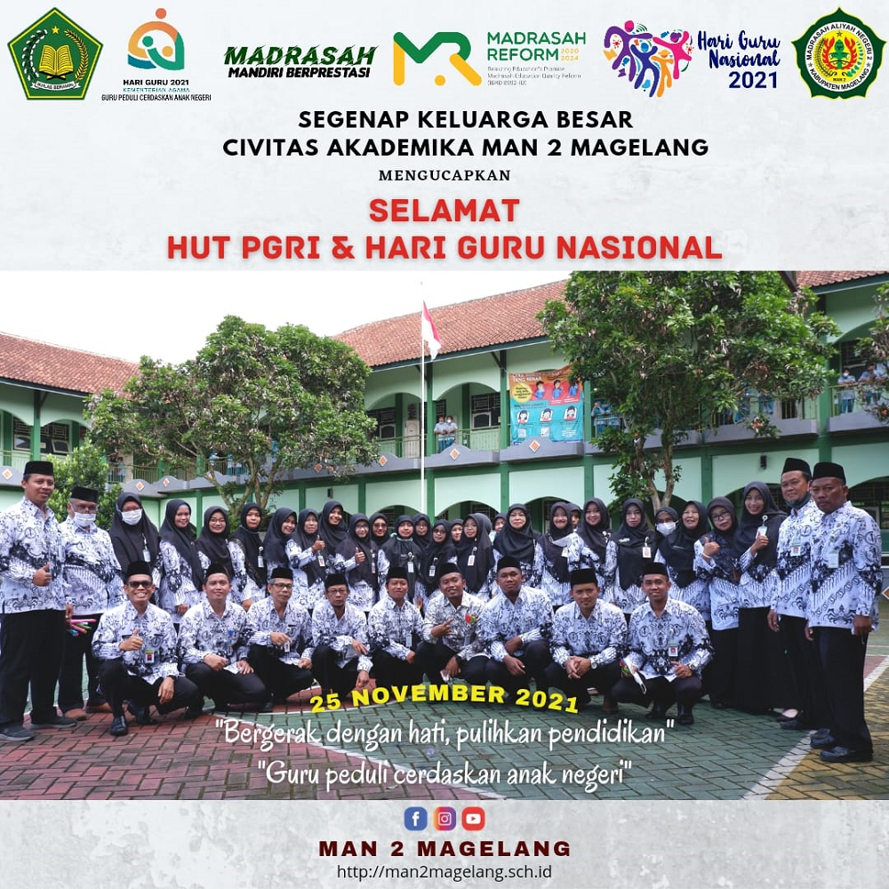 Magelang– mandama.sch.id. HUT PGRI diperingati setiap 25 November sebagai Hari Guru Nasional. Peringatan HUT PGRI sekaligus Hari Guru Nasional sebagai apresiasi kepada guru-guru di Indonesia atas jasanya dalam dunia pendidikan. Siswa MAN 2 Magelang usai pelaksanaan upacara Hari Guru Nasional ke-27 menyayikan lagu Hymne Guru, Terimakasihku dan Sholawat. Lagu tersebut kerap didendangkan anak sekolah kala HGN menjelang. Bahkan bisa dikatakan lagu tersebut menjadi lagu wajib mereka, sembari mempersembahkan puisi, buket bunga, bingkisan sederhana balon dan juga tumpeng namun bermakna untuk segenap guru, tenaga kependidikan dan warga madrasah. Kepala Madrasah, Guru, Karyawan Tata Usaha, Tukang Kebun sampai dengan Cleaning Service pun tak ketinggalan mendapatkannya.